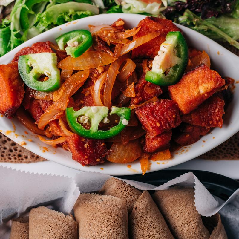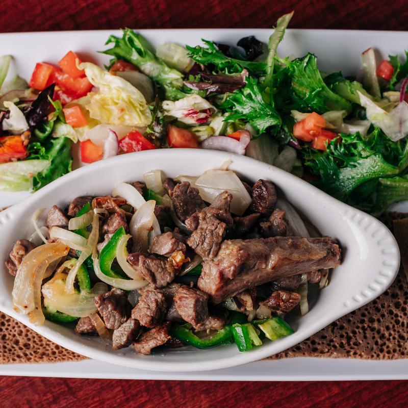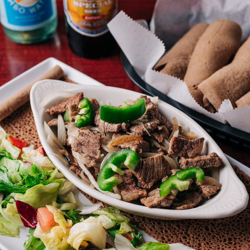 Beef tenderloin, onion, tomato, and jalapenos sautéed and mixed with pieces of injera.