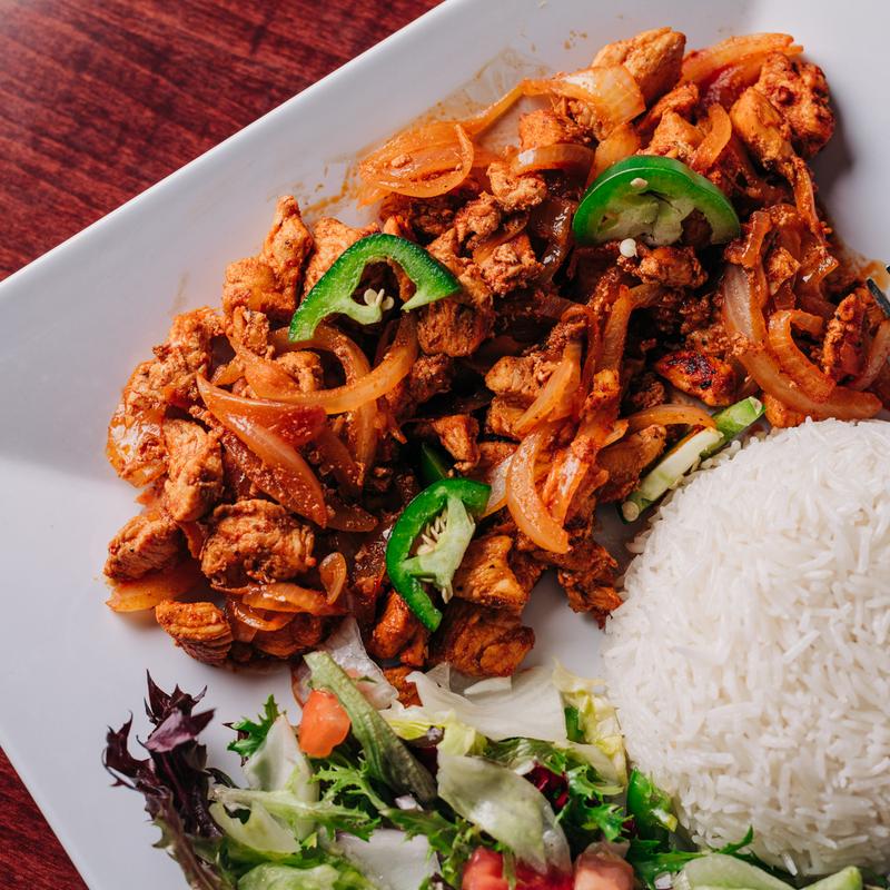 Cubs of chicken breast, onion, tomato, jalapenos, house blend spices, sautéed, served on rice or Injera.