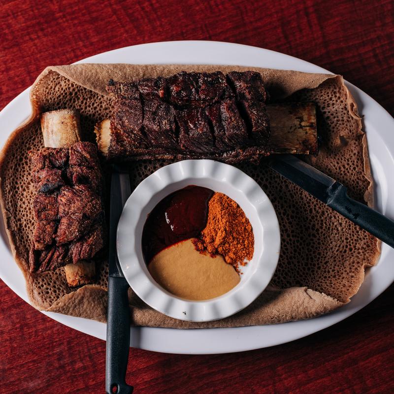 Sizzling prime short ribs marinated with Ethiopian herbs, fresh onion, tomatoes, garlic, and jalapeños.
