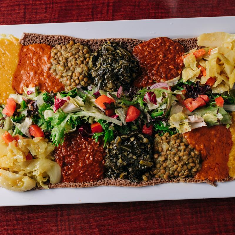For 4+ People. Roll sampler appetizer of Misir, Shiro & Kik Rolls. Our Meat Combo, Veggie Combo & Zil Zil Tibs.