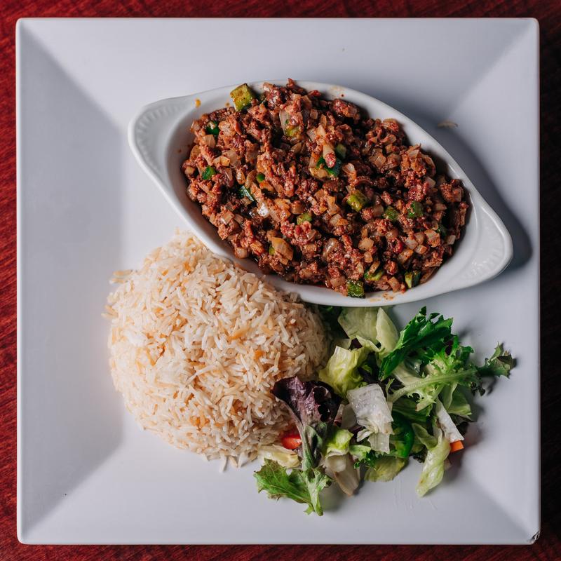 Spicy country-style ground beef, liver and tripe mixed with Ethiopian butter (Kibe). Request rare, medium, or well done.